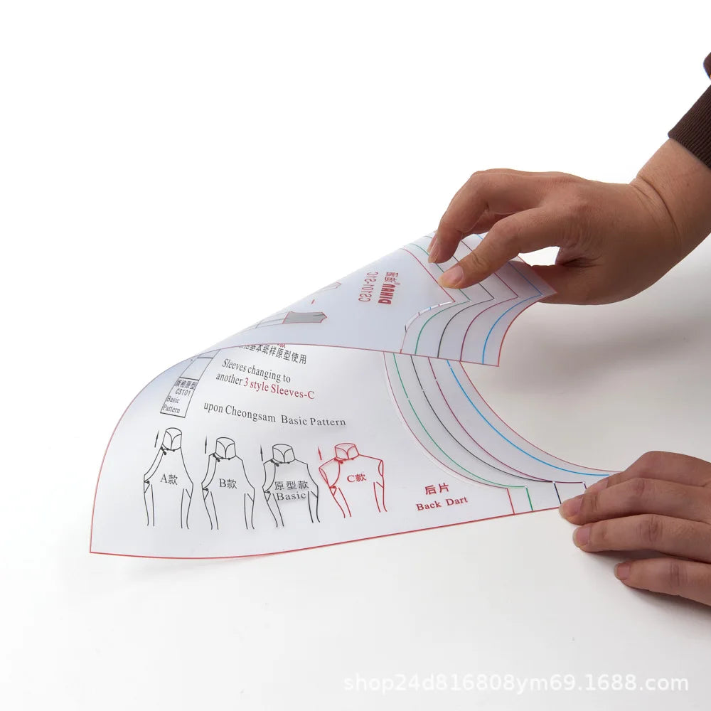 Made from high-transparency plastic, the template allows clear visibility of underlying pattern lines for precise alignment and tracing. The multi-size integrated design combines multiple sizes into a single template, improving efficiency and reducing the need for multiple pattern sets. The material is thin yet flexible, offering durability and ease of handling during drafting, and can be rolled for compact storage, making it suitable for studios, classrooms, and on-the-go pattern work.